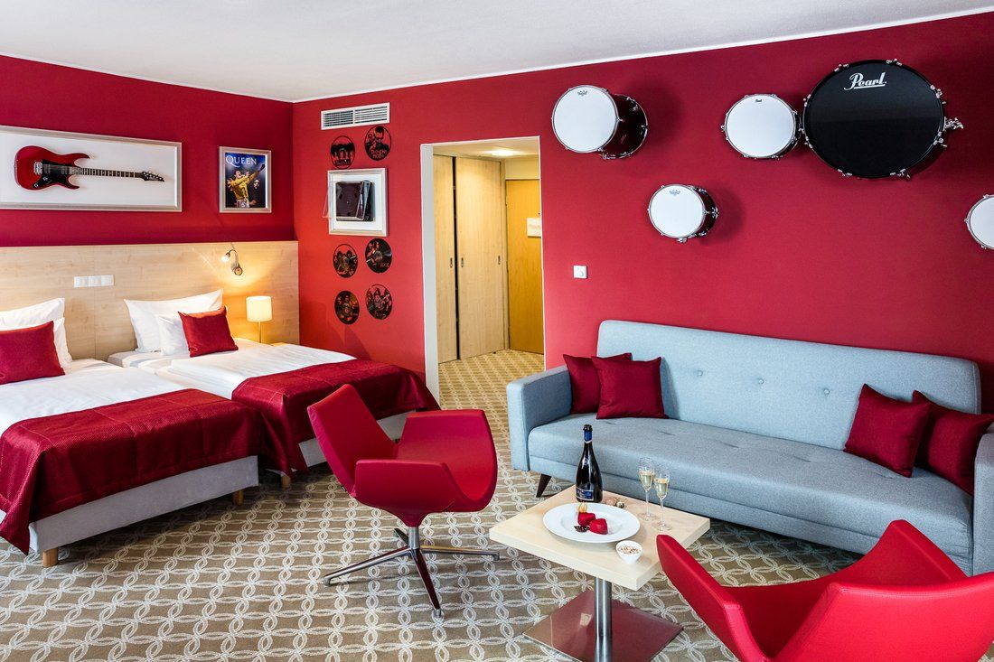 Hard Rock Suite suite with bold color tones and unconventional decorations, inspiring atmosphere of music.