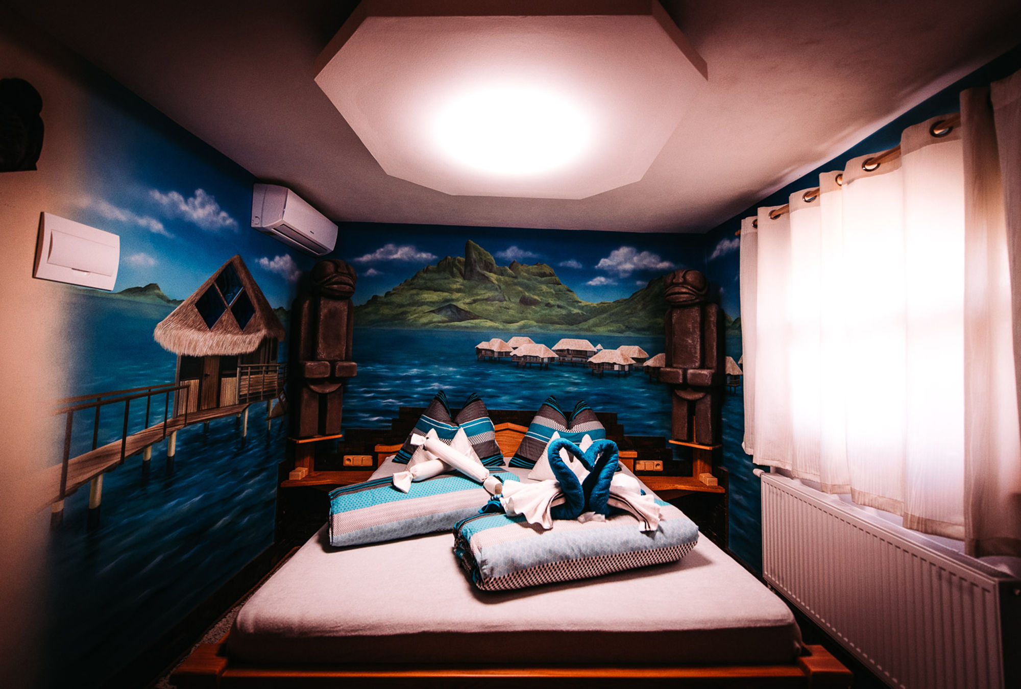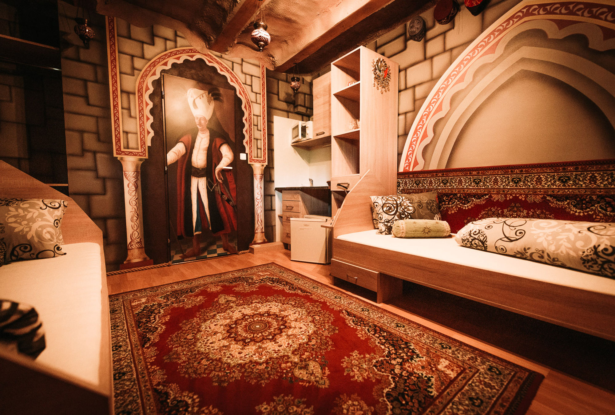 The four- to five-bed apartments are furnished in the style of individual countries (Mexico, Kenya, Egypt, America, Turkey, Spain, Indonesia and others are being prepared) and are equipped with a bathroom with shower and toilet, TVSAT, minibar and Wi-Fi internet connection. All have a view of the pond, some have a balcony and some have outdoor seating.