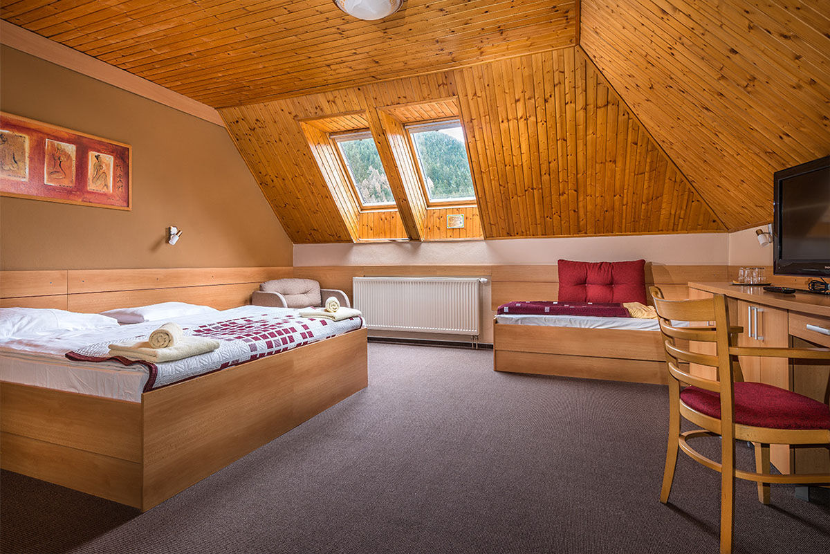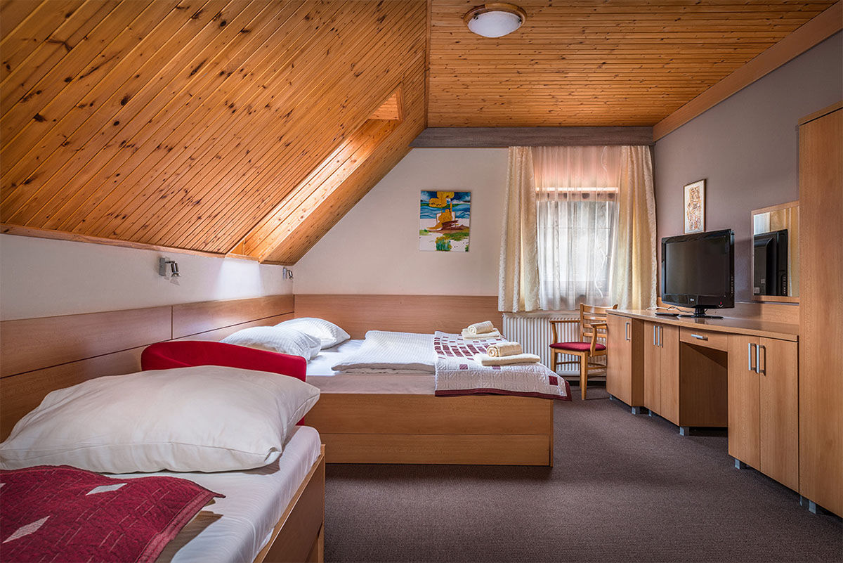 Dvou a třílůžkové pokoje a apartmány (vše s možností přistýlky) vybaveny SWC, TVSAT, telefonem a internetem.