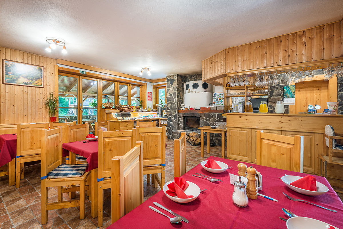 Pro ubytované hosty je možnost výběru z polopenzí ne plné penze. Snídaně se podávají formou bohatých švádských stolů, na kterých najdete teplá a studená jídla, sýrové a salátové mísy, zeleninu, ovoce, široký výběr pečiva, saláty, paštiky, cereálie, sladké pečivo, mléko, vodu a kávu.