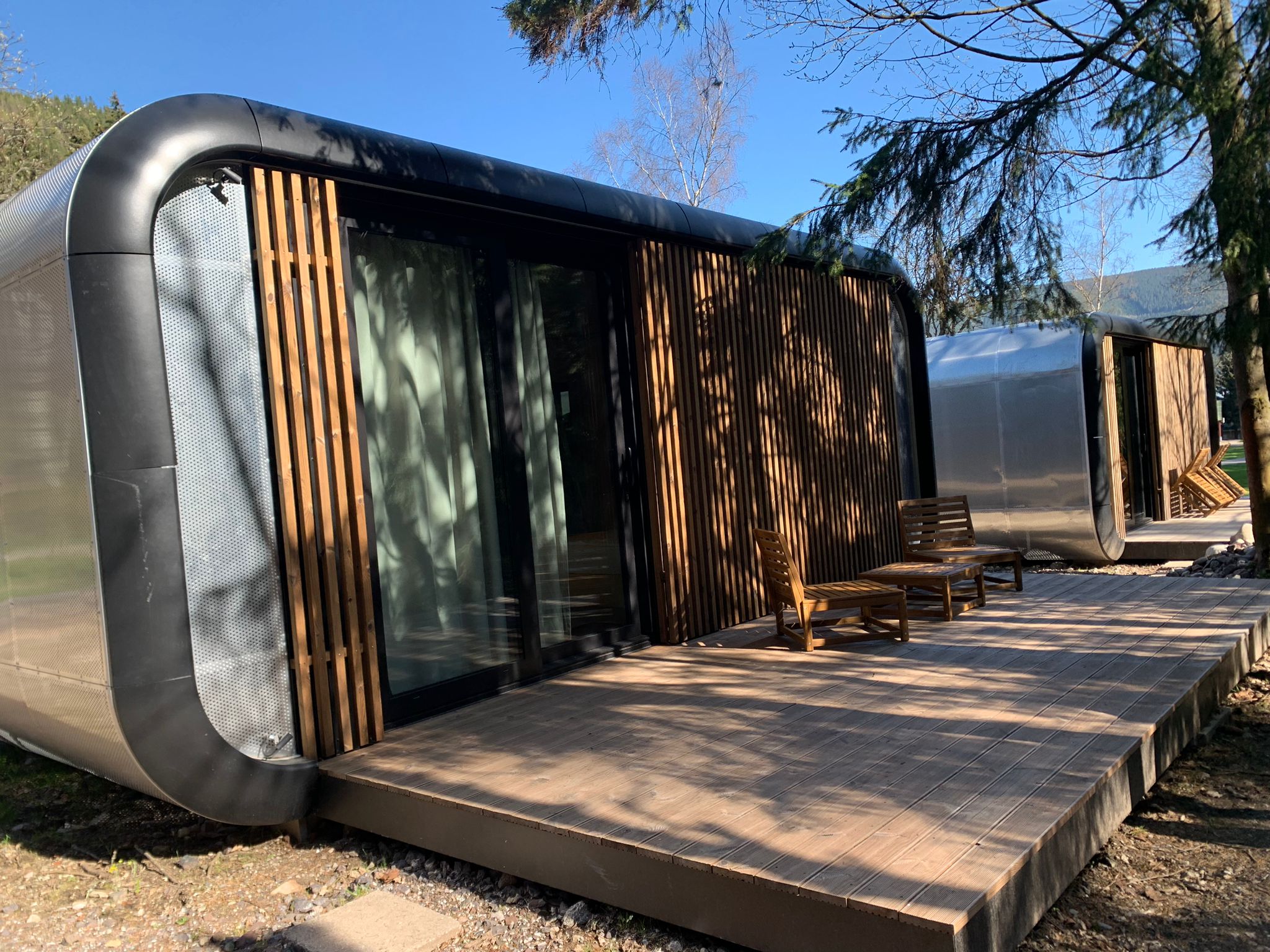 Glampingové domky nad řekou jsou mají obložený luxusní interiér, moderně zařízená kuchyně, manželské lůžko, včetně koupelny se sprchovým koutem.