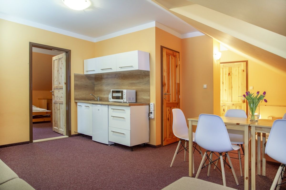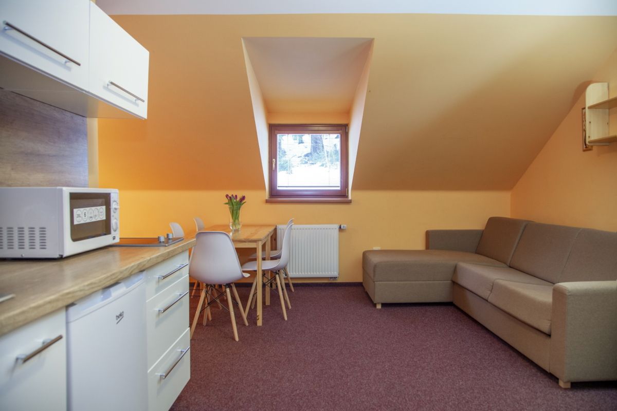 Apartmán 4 pro 2-3 osoby (27m²), II podlaží, vybaven soiálním zařízením, rozkládací sedačka k plnohodnotnému spaní pro 2 osoby, + 1 postel, noční stolky, konferenční stolek, jídelní stůl, 3 židle, kuchyňka vybavena 2 plotýnkovým vařičem, varná konvice, mikrovlnná trouba, základní vybavení kuchyně k vaření a konzumaci, sklo, lednice s malým mrazákem, skříň, police, němý sluha, šatna, komoda, mini lednice, televize.