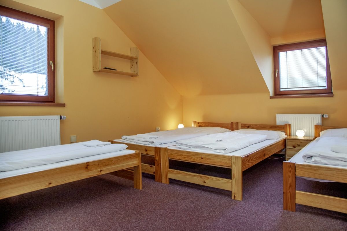 Apartmán 3 pro 4 osoby (35m²), I podlaží, o 2 ložnicích, vybaven sociálním zařízením, dvojlůžko, noční stolky, konferenční stolek, rozkládací sedačka k plnohodnotnému spaní pro 2 osoby, jídelní stůl, 4 židle, kuchyňka vybavena 2 plotýnkovým vařičem, varná konvice, mikrovlnná trouba, základní vybavení kuchyně k vaření a konzumaci, sklo, lednice s malým mrazákem, mini lednice, 2 x televize.